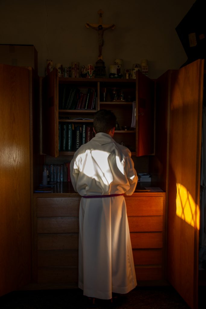 In die Albe fertig los. Vor dem Gottesdienst muss alles schnell gehen.