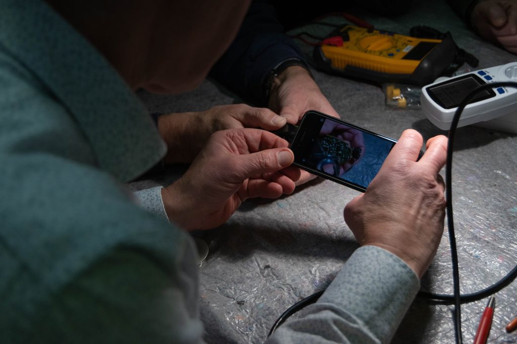 Peter Stumm macht mit sei­nem Handy ein Foto von der Leiterplatte. So kann er auf dem Bild her­an­zoo­men und die klei­nen Verbindungen auf der Platte bes­ser erken­nen.